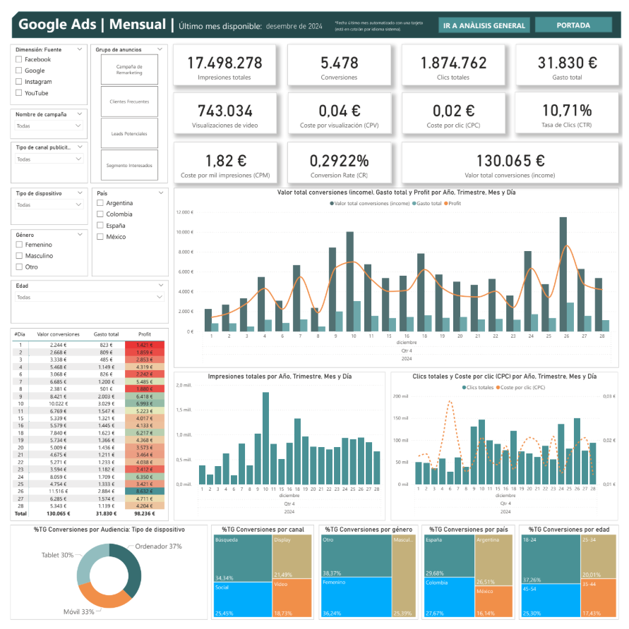 El report, permite ver los KPI más importantes de la empresa, como el coste por clic (CPC), o la conversion rate (CR).