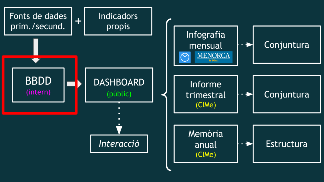 El proyecto integra datos del INE, IBESTAT, Ministerio de Fomento, Consell Insular de Menorca, TGSS, SOIB, AENA, Ports IB, Registro Mercantil…, y combina: