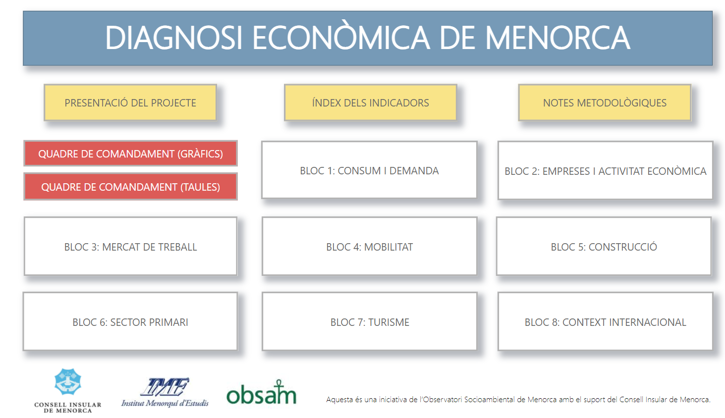 La herramienta se organiza en 8 grandes bloques temáticos que permiten analizar la economía menorquina desde múltiples ángulos: