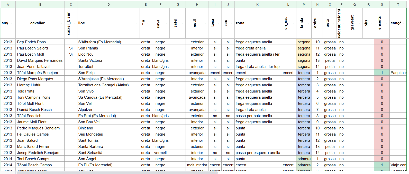 A partir del visionado y clasificación de material audiovisual de las fiestas celebradas entre los años 2006 y 2024, creamos una base de datos para recoger la información detallada de más de 600 carreras: raza del caballo, estilo de carrera, nombre del jinete, acierto/no acierto…